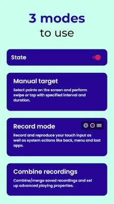 Auto Clicker Automatic Tapper connects recordings together using combinations with advanced settings for speed, delays, and repetitions. Customize your automated tasks with precision using the Auto Clicker Automatic Tapper.