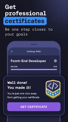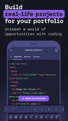 Code anytime, anywhere, with an innovative and interactive programming and code learning app in your pocket! Learn programming in Python, HTML, JavaScript, SQL, CSS, TypeScript, React, Express, and Node.JS on the go with the Mimo coding app, an accessible and beginner-friendly code app. With bite-sized lessons, a flexible learning schedule, and tons of practice, Mimo: Learn Programming guides you step by step, making learning programming and practicing your Python, JavaScript, React, HTML coding skills easy. In just 5 minutes a day, you can learn code of the popular programming languages like Python, HTML, or JavaScript, practice and learn coding, work with the code to build projects, and get certified for your skills in no time.