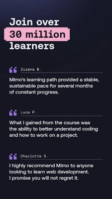 Start your coding journey with the Mimo Learn Programming app and unlock your career in tech. With our courses in Python, HTML or JavaScript, TypeScript, CSS, SQL, React, real projects, and tons of practice, you can learn to code and reach your career aspirations. You can code, too!
