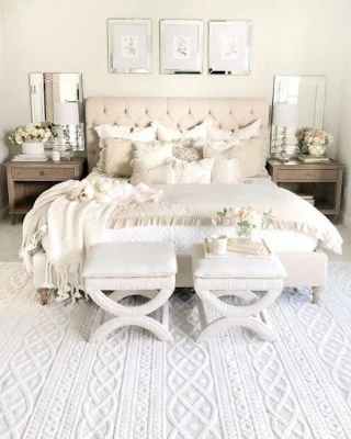 You will see a variety of different luxurious bedroom furniture, including linens, pillows, bedside tables, chairs, and even a bed with sofa.