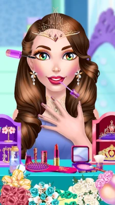 Enter the makeup salon with our bride and apply eyeliner, lipstick, mascara and other products. Match her makeup with her nails. Create a lovely manicure using pastel colors and sparkly decorations.